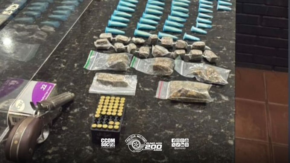 Foram apreendidos maconha, haxixe, crack, cocaína, um revólver calibre .22 com 30 munições, 7 cápsulas deflagradas e 1 munição picotada, além de uma motocicleta utilizada na tentativa de fuga.