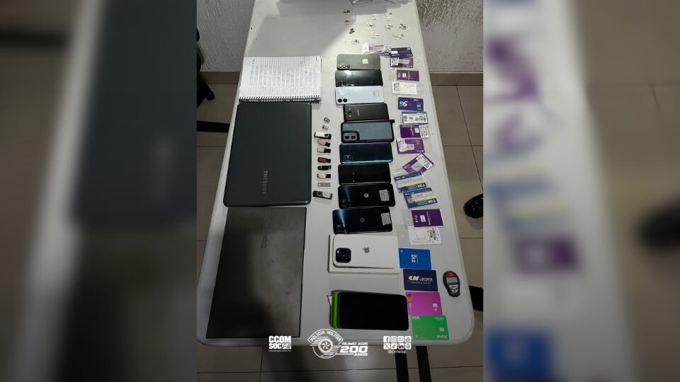 Diante da declaração, os policiais realizaram a vistoria no interior da garagem, onde localizaram 10 aparelhos celulares, uma máquina de cartão — segundo o suspeito registrada em nome de terceiros (“laranjas”) —, dois notebooks, diversos chips de diferentes operadoras, além de pendrives e cadernos com anotações contendo números de contas bancárias e CPFs.