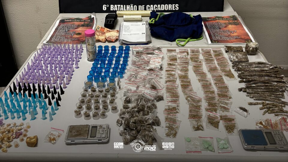 Com ele, os policiais encontraram R$ 323 em dinheiro e uma grande quantidade de entorpecentes: 133 eppendorfs de crack, 270 de cocaína, 121 tabletes e 129 potes de maconha, além de 82 potes de “ice”e oito comprimidos de origem desconhecida, totalizando 1,185 kg de drogas.