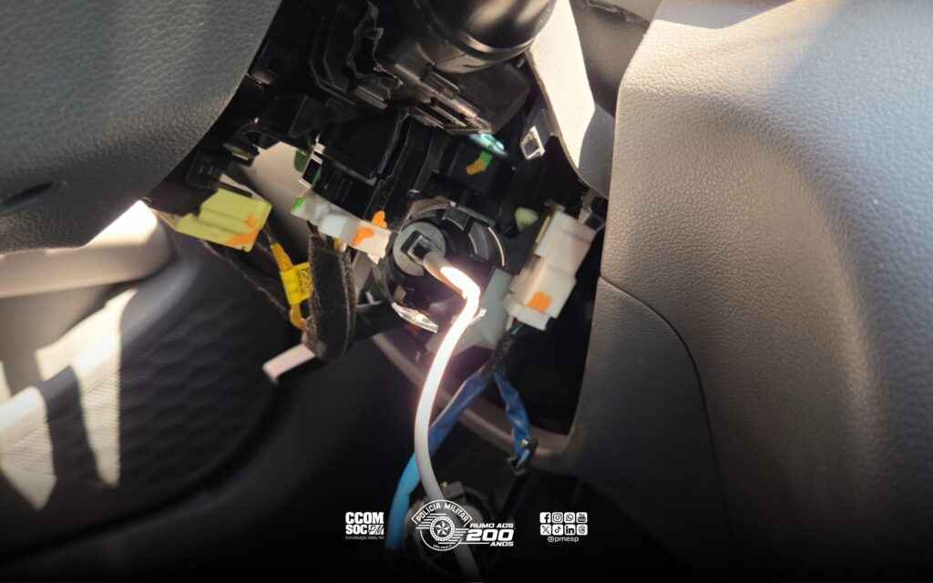 Durante a fiscalização, os policiais verificaram que o cilindro de partida do carro estava adulterado e adaptado para dar partida com uma chave micha USB.