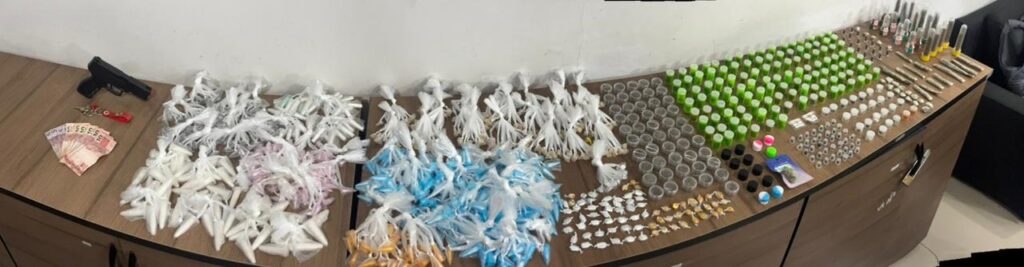 Durante a aproximação das equipes, o casal alvo das investigações foi abordado. Em buscas realizadas no quarto da residência, os policiais localizaram um maço de cigarros contendo 48 porções de crack e quatro porções de cocaína, já fracionadas e prontas para comercialização. Na cozinha do imóvel foram apreendidos R$ 442,00, 02 rádios comunicadores, 07 câmeras de monitoramento, 02 aparelhos celulares e uma máquina de cartão de crédito.