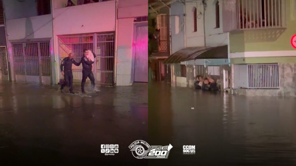 Nível da água sobe e policiais militares resgatam família que teve casa alagada pela chuva na zona leste de SP