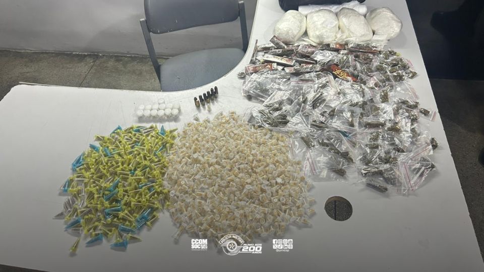 Ao todo, foram apreendidas 566 porções de maconha, 674 porções de crack e 1.900 porções de cocaína, totalizando cerca de 2,9 quilos de drogas. Também foram recolhidas sete munições calibre .40, quatro munições calibre 9x19mm, quatro celulares e R$ 107,00 em dinheiro.