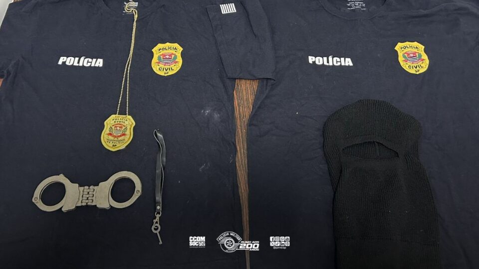 Entretanto, em vistoria no interior do local onde o indivíduo havia se escondido, os policiais localizaram diversos objetos de origem ilícita, incluindo duas camisetas com logotipo da Polícia Civil do Estado de São Paulo, um distintivo de Investigador da Polícia Civil, uma algema com chave sem identificação, 24 chaves mixas, dois aparelhos celulares e a quantia de R$ 1.120,00.