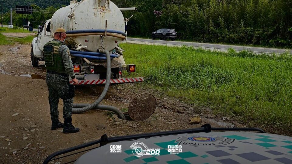 Durante patrulhamento ambiental no bairro Tabatinga, em Caraguatatuba, uma equipe do Grupo Especial de Policiamento Ambiental em Área de Risco (GEPAAR), da Polícia Militar Ambiental, flagrou um caminhão realizando o despejo irregular de dejetos em uma galeria de esgoto localizada nas proximidades da margem do Rio Tabatinga.
