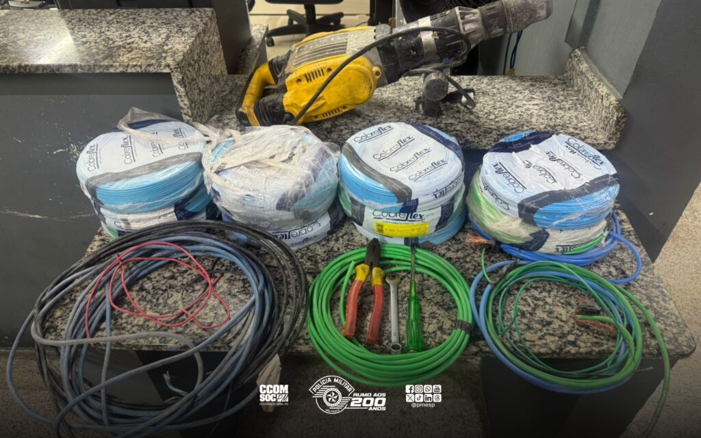 Fios de cobre, martelete e outras ferramentas foram recuperadas. Câmeras de segurança identificaram os criminosos. Dois criminosos foram presos em flagrante por furto, na madrugada de hoje (27), em Diadema/SP. Fios de cobre e um martelete furtados de um condomínio em construção foram recuperados pela Polícia Militar. Por volta das 2h45, a dupla caminhava com sacos grandes pela Praça Castelo Branco e levantou a suspeita de uma equipe do 24º Batalhão de Polícia Militar Metropolitano, que patrulhava a região. Na abordagem, os policiais encontraram algumas ferramentas, como alicate e chave de fenda, além de rolos de fio de cobre e um martelete, material que foi avaliado em cerca de R$ 9 mil. Os criminosos disseram que haviam encontrado os produtos dentro de uma caçamba, porém, durante diligências pelo local, a PM contatou o vigilante de um condomínio em obras, que denunciou o crime. Câmeras de monitoramento do local, flagraram o momento que os indivíduos chegaram na obra e, momentos depois, saíram carregando os sacos com os materiais. A dupla foi encaminhada à Polícia Civil e permaneceu presa. COMUNICAÇÃO SOCIAL PMESP
