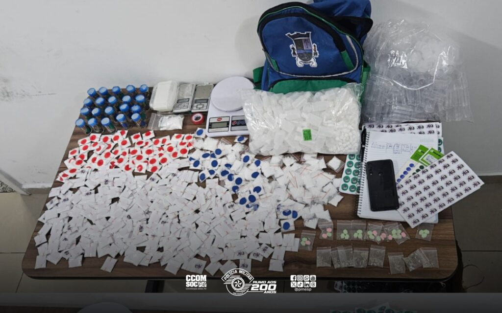 Imóvel usado pelo crime foi identificado e quase 500 porções de drogas prontas para a venda foram apreendidas. Na noite de ontem (26), a Polícia Militar prendeu um traficante de drogas em flagrante, durante uma abordagem realizada no bairro Sacomã, Zona Sul de São Paulo/SP. O criminoso foi flagrado por uma equipe do 46º Batalhão de Polícia Militar Metropolitano quando saía de uma viela na região e correu ao perceber a aproximação da viatura. Ele foi detido logo em seguida com algumas porções de drogas. Aos policiais, o indivíduo indicou um apartamento que era usado para armazenar entorpecentes. No local, foi apreendido o restante das drogas, em um total de 494 porções de maconha, cocaína e comprimidos de MDMA. Além disso, também foram encontradas balanças de precisão, celulares e dinheiro. O criminoso foi conduzido ao 26º Distrito Policial e permaneceu preso. COMUNICAÇÃO SOCIAL PMESP
