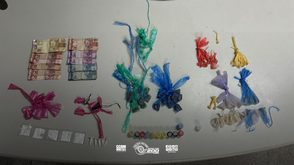 Ao todo, foram apreendidas 41 porções de maconha, 25 papelotes de cocaína, 41 porções de crack e R$ 136,00 em dinheiro.
