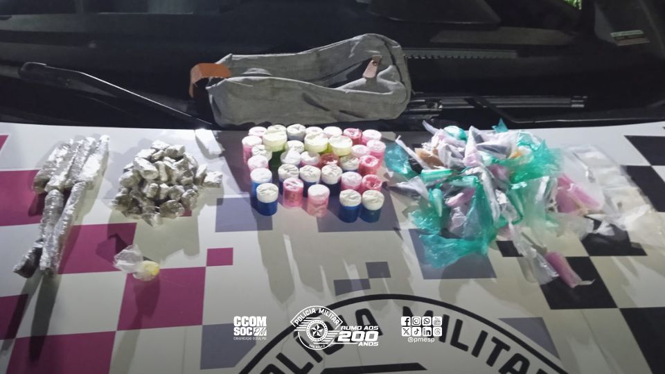Durante a busca, os policiais localizaram uma caixa de papelão contendo uma pochete, em cujo interior havia diversas embalagens com substâncias aparentando ser drogas. Ao todo, foram apreendidos 87 eppendorfs de cocaína, 38 porções de maconha prensada, 32 porções de “flor” de maconha e um comprimido de ecstasy.
