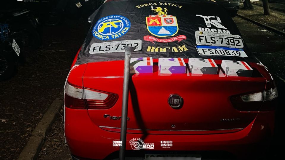 Durante patrulhamento, a equipe avistou um veículo vermelho estacionado em frente a uma farmácia fechada e realizou a abordagem. Na busca pessoal, nada de ilícito foi localizado. No entanto, durante a vistoria veicular, os policiais encontraram um pé de cabra, sacolas contendo medicamentos da marca Mounjaro, além de placas veiculares diversas.