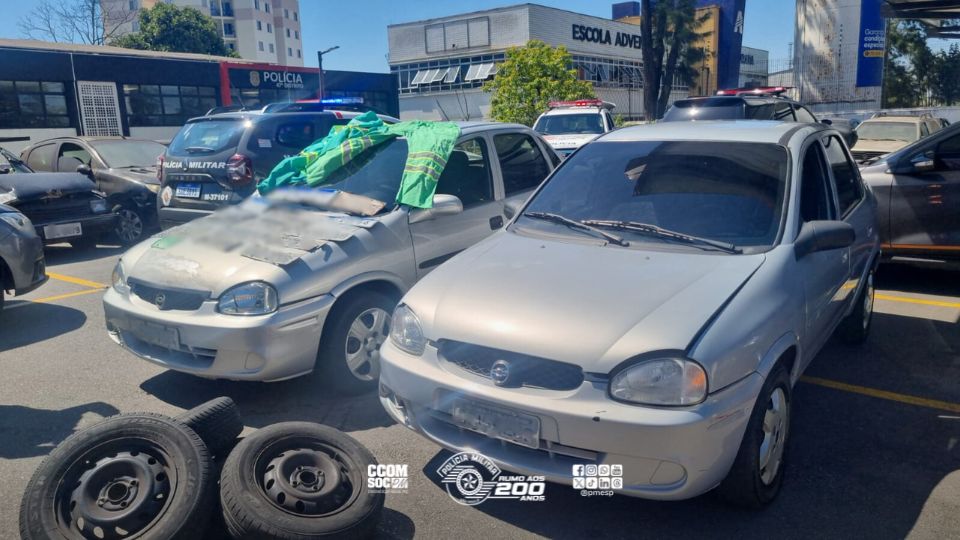 Em vistoria, os policiais encontraram o segundo veículo, também um Corsa prata, com claros sinais de adulteração em motor e chassi. No interior, havia uniformes de empresa de limpeza. A consulta ao sistema revelou divergências de cor e numeração, confirmando a adulteração.