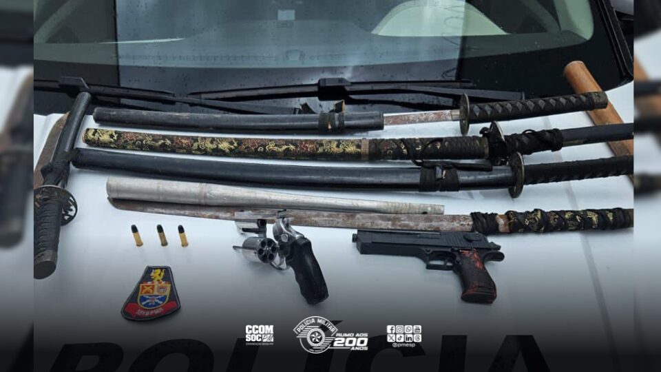 Durante a abordagem, os policiais realizaram busca pessoal e localizaram um revólver calibre .38 com numeração suprimida, quatro munições intactas e uma deflagrada.