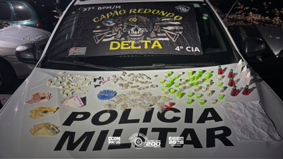 No local, foram apreendidas 182 porções de drogas, entre maconha, cocaína, crack, haxixe e lança perfume, totalizando mais de 600 gramas, além de R$ 332,00 em dinheiro e uma folha com anotações do tráfico.