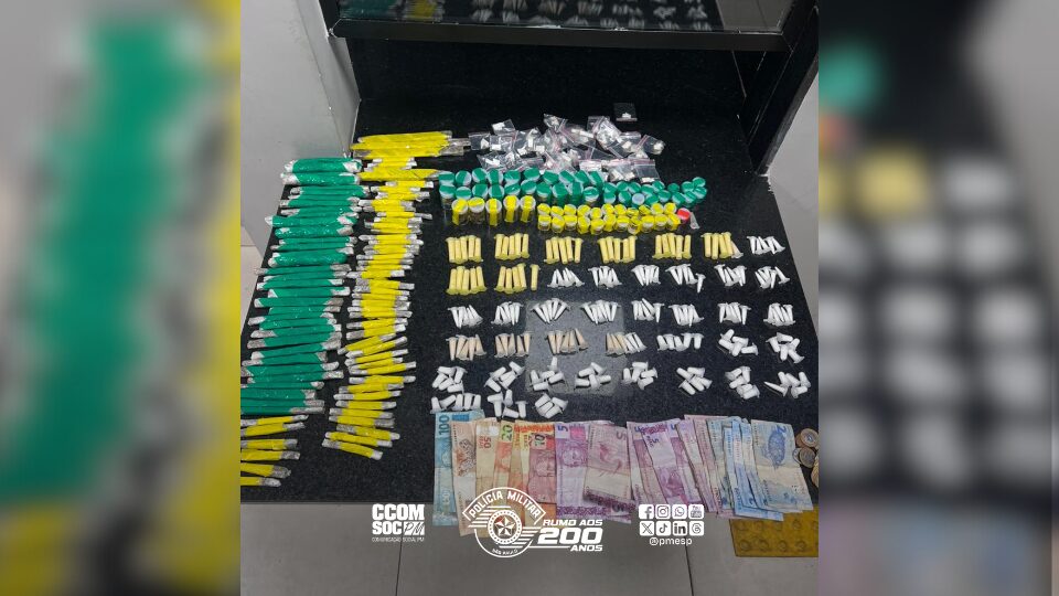 Durante a abordagem, foram encontradas 55 porções de cocaína prontas para venda, uma porção maior da mesma droga, uma porção de crack e R$ 70 em dinheiro. Com a adolescente, havia sete porções de maconha. Em buscas na residência do indivíduo, foram localizadas ainda uma munição calibre .38, uma balança de precisão e mais uma porção de crack.