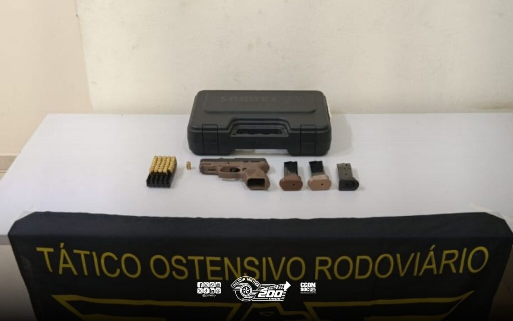 A atitude chamou a atenção dos policiais, que seguiram no acompanhamento até o km 161, onde a dupla foi abordada. Durante a fiscalização, uma pistola .9mm com carregadores e munições foi localizada no porta-malas.