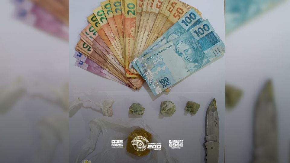 Na abordagem, a equipe apreendeu 16 frascos com maconha e uma porção de haxixe, além de dinheiro. O criminoso foi apresentado no 8º Distrito Policial e permaneceu preso.