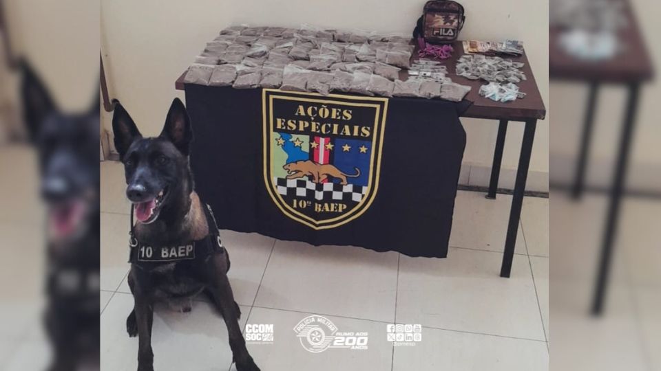 Nesta quinta-feira (18), policiais militares do 10º Batalhão de Ações Especiais de Polícia em patrulhamento com o canil, visualizaram uma mulher na via pública portando uma pochete. Ao notar a aproximação policial, ela tentou fugir pelo interior da comunidade, sendo abordada logo em seguida.