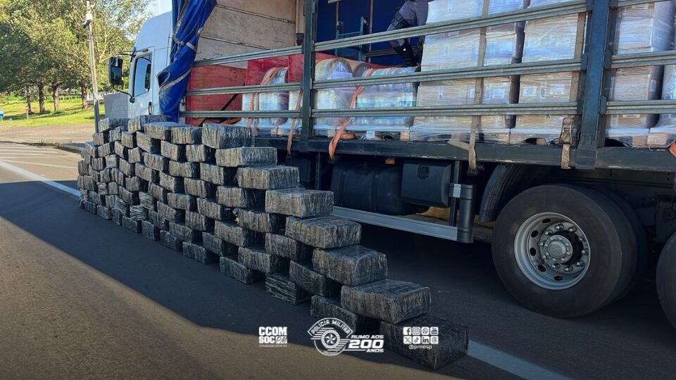 Durante a fiscalização de um veículo de carga, os policiais localizaram grande quantidade de entorpecentes — a estimativa inicial é de aproximadamente uma tonelada de maconha.
