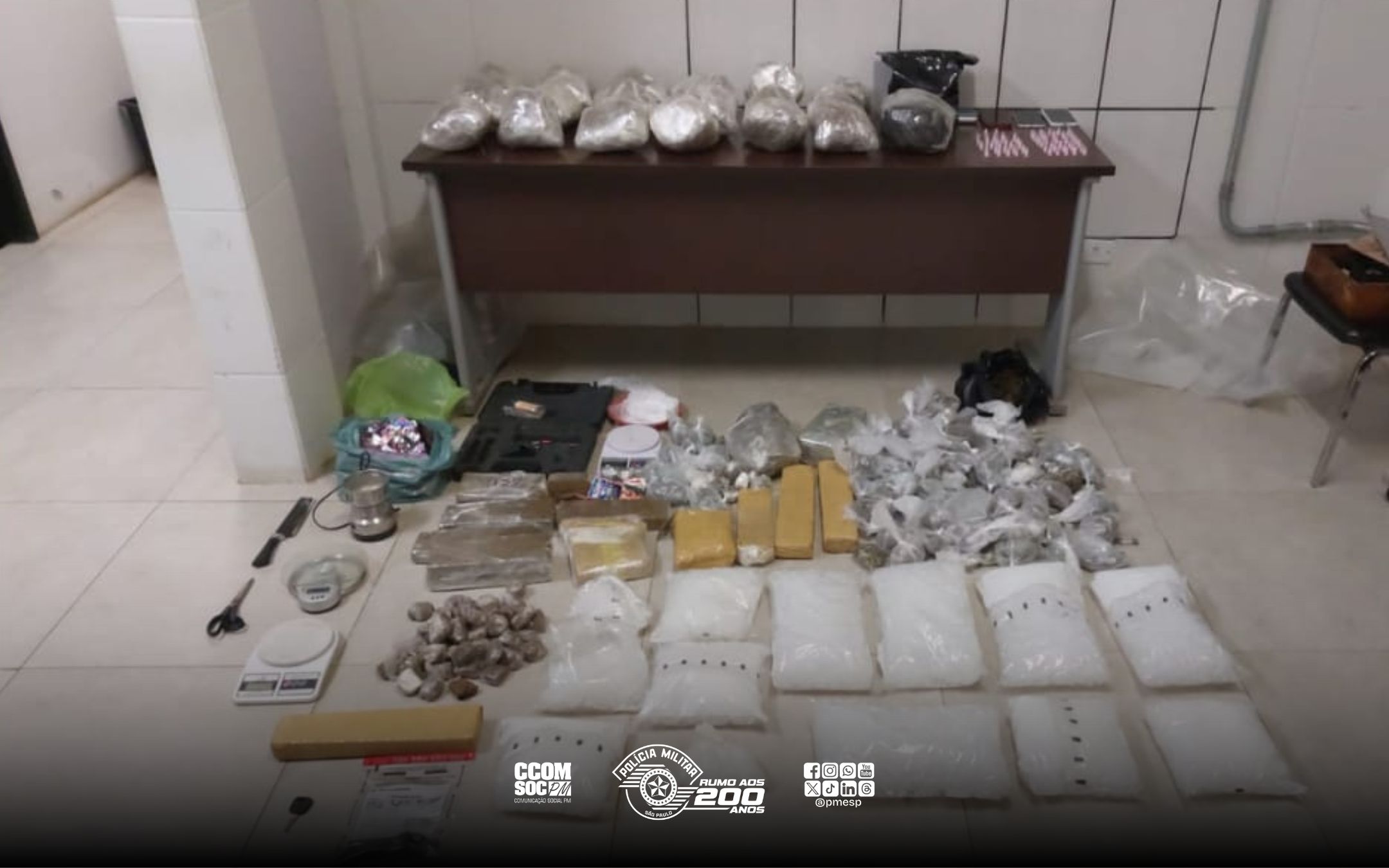 Com a dupla, a equipe de Força Tática do 4º Batalhão de Polícia Militar do Interior apreendeu diversas porções de cocaína, crack e haxixe, além de cerca de R$ 1,5 mil em dinheiro, um simulacro de arma de fogo, celulares, balança de precisão, anotações com o controle das vendas de entorpecentes e até um liquidificador com resquícios de cocaína.
