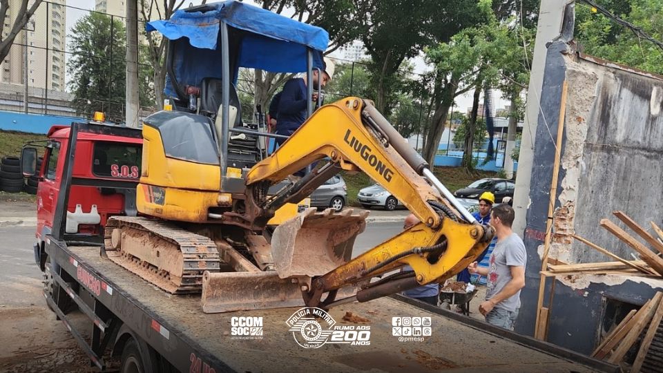 Os equipamentos permanecem sob a guarda dos proprietários, seguindo a orientação da Mensagem nº 1BPAmb-579/13/25, que trata da suspensão do serviço de remoção de veículos pesados. Todos os procedimentos legais foram formalizados e entregues aos responsáveis pela obra.