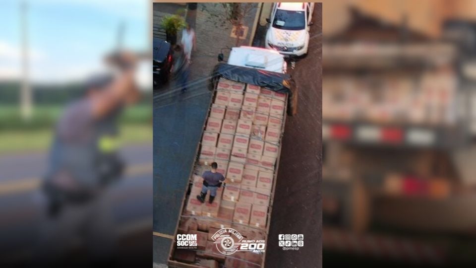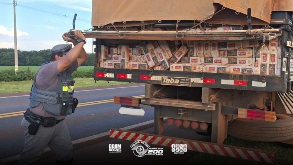 Durante a fiscalização, a equipe abordou um caminhão ocupado apenas pelo condutor, que inicialmente afirmou estar com o veículo vazio. Ao verificar a carroceria, retirando parte da lona, os policiais constataram que havia grande quantidade de caixas com cigarros.