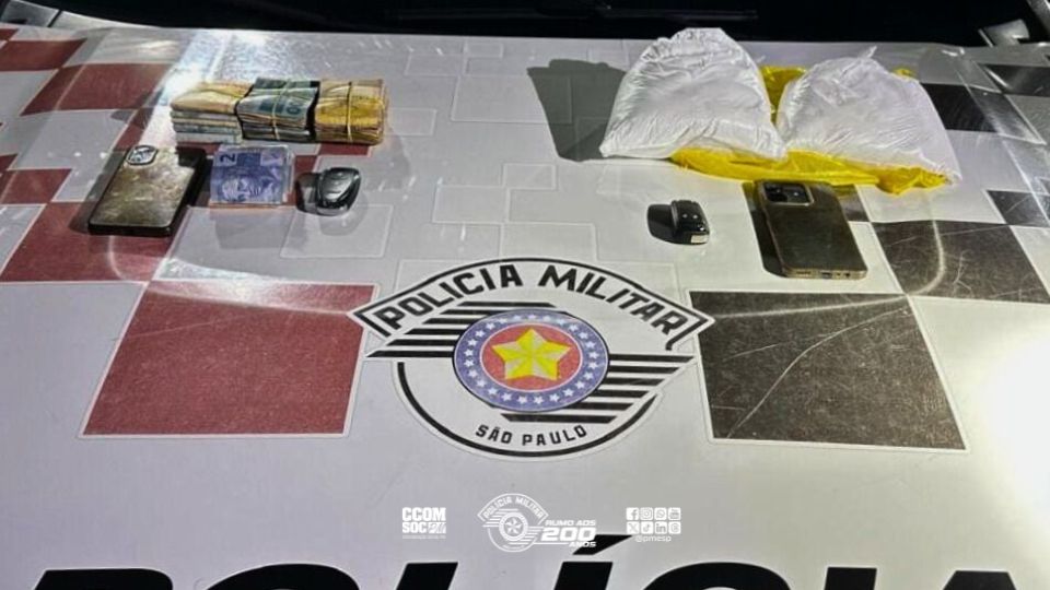 Na sacola, foram encontrados dois pacotes de pó branco, totalizando aproximadamente 2 quilos. O outro veículo, que havia deixado o local, foi acompanhado e abordado pelos policiais, sendo localizado o valor de R$ 16.825,00 em espécie e dois celulares.