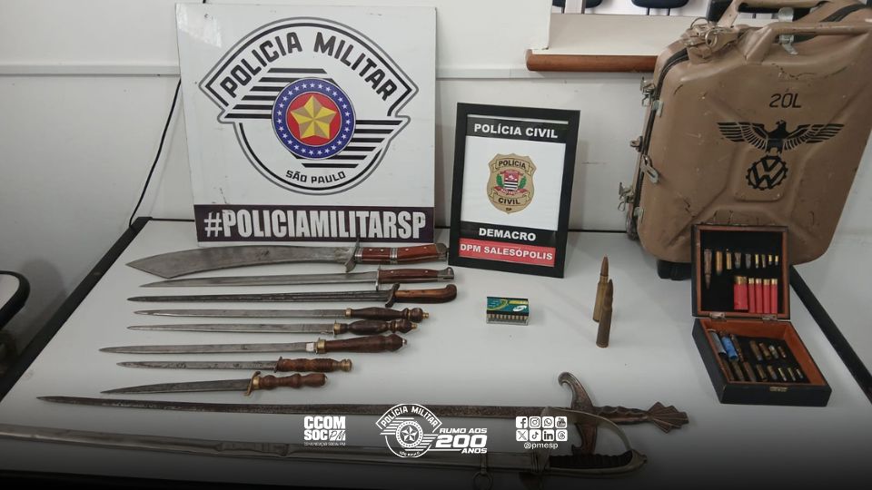 Durante patrulhamento na feira livre de Salesópolis (SP), policiais militares do 17º BPM, com apoio de agentes civis, prenderam em flagrante um homem pela venda ilegal de munições e posse de armas brancas.