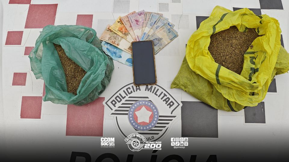 No porta-malas do carro, os policiais encontraram aproximadamente 1,3 kg de maconha, além de R$ 238 em dinheiro e um aparelho celular. O indivíduo foi conduzido ao Plantão Policial local, onde permaneceu à disposição da Justiça.