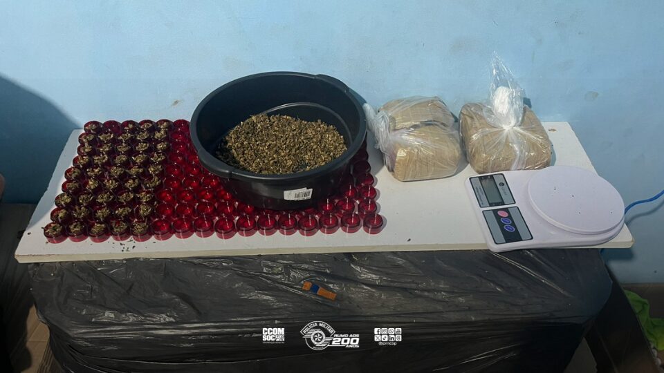 Com autorização para ingresso no imóvel, a equipe realizou vistoria e confirmou a existência de vasta quantidade de drogas e apetrechos relacionados ao tráfico. Foram apreendidas: