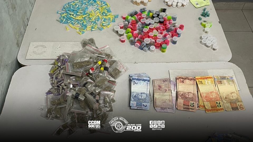 Na abordagem, os policiais encontraram R$ 30,00 em dinheiro e, dentro da sacola, porções de entorpecentes, anotações referentes ao tráfico e um celular. Com o segundo indivíduo, foram apreendidos R$ 34,00 em dinheiro e três celulares — um deles conectado a um sistema de monitoramento com câmeras instaladas em vias próximas, utilizado para vigiar a movimentação policial.