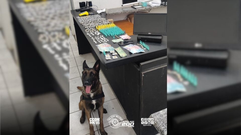Com apoio de cão policial, a equipe realizou buscas no imóvel e encontrou mais drogas escondidas em um dos quartos, além de materiais usados na preparação e comercialização.