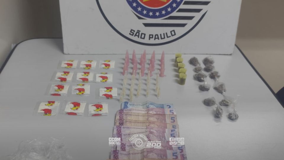 Durante patrulhamento pela Rua Emília Fuad Ageje, a equipe avistou três pessoas — dois homens e uma mulher — em atitude suspeita. Ao perceber a aproximação da viatura, um dos indivíduos dispensou porções de cocaína e maconha. Ele foi abordado e, com ele, foram encontrados R$ 120 em dinheiro.