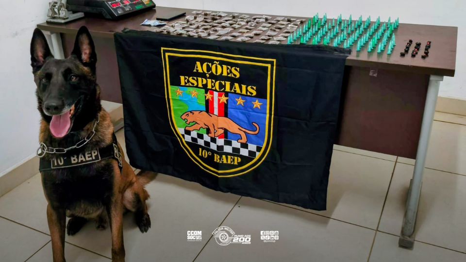 Na sequência, durante varredura com o cão policial Blaster, houve indicação positiva para presença de drogas em uma viela da comunidade. Em uma sacola plástica, os policiais encontraram porções de maconha, cocaína e crack já fracionadas e prontas para a comercialização.
