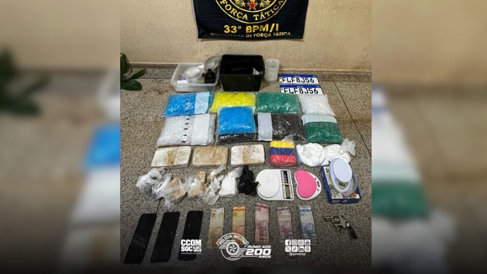 Foram apreendidos: 267 eppendorfs de cocaína, 56 porções de maconha, 739 pedras de crack e R$ 990,25.