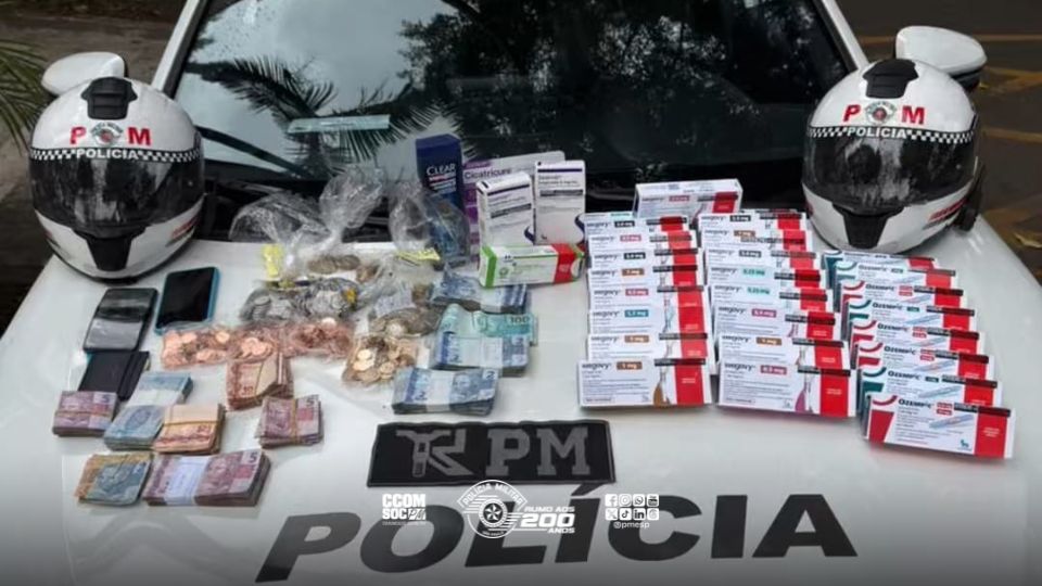 Durante a busca pessoal e no interior do veículo, foram apreendidos diversos medicamentos de uso controlado, como Ozempic, Wegovy, Saxenda e Prolia, além de R$ 3.789,00 em espécie.