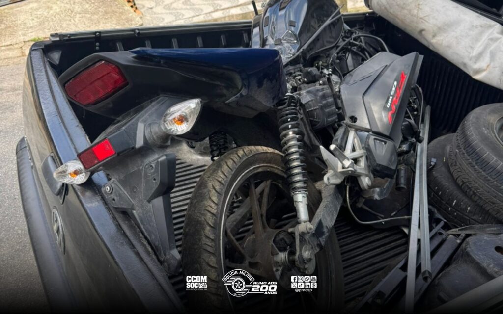 Durante vistoria na área, os policiais localizaram uma motocicleta, sem placas e parcialmente desmontada. A consulta do número do chassi revelou que o veículo possuía queixa de roubo registrada no dia 6 de novembro de 2025,
