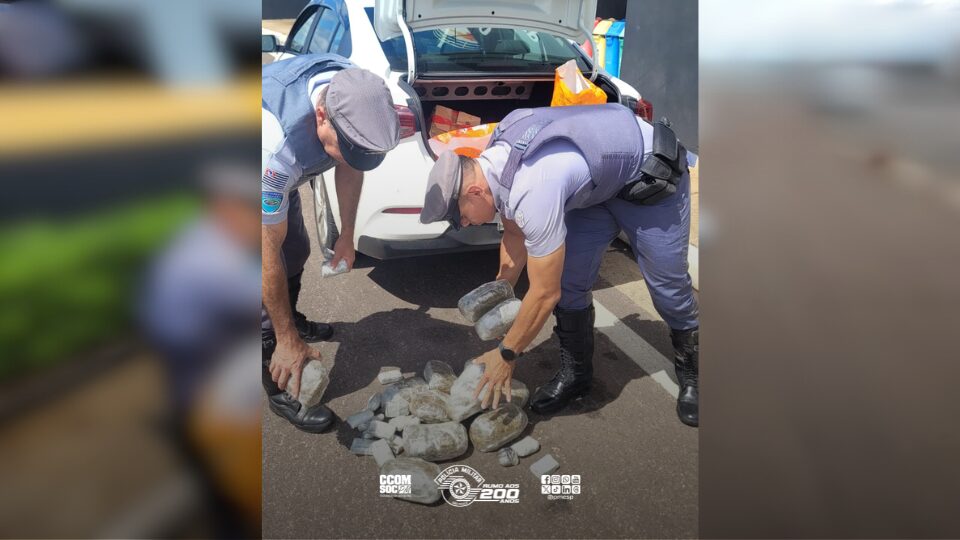 A equipe abordou um veículo GM/Onix e, durante a vistoria no interior do automóvel, localizou 17 tabletes de maconha do tipo conhecido como “bucha colombiana” e 32 tabletes da droga conhecida como “Dry”.